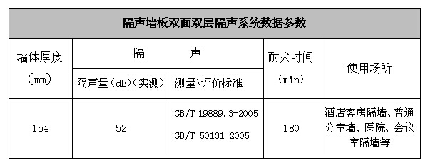 无机高强隔声墙板单板隔声为30dB,可通过不同的结构系统,将隔声量提高,分别有双面单层(48dB)、双面双层(52dB)、双面双龙骨五层(59dB)等。具体数据如下: